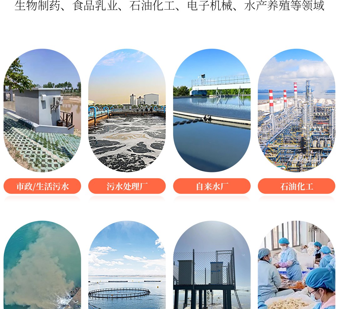 水环境自动监测站、污水处理厂、自来水厂、冶金钢铁生物制药、食品乳业、石油化工、电子机械、水产养殖等领域